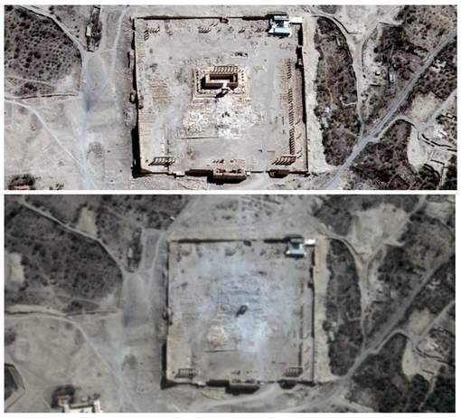Sur une image satellite du 27 Août on voit clairement le temple, une structure rectangulaire entourée de colonnes, dont l'érection s'est achevée au second siècle. Sur un autre cliché pris lundi, seules quelques colonnes situées à l'extrémité du site sont visibles.