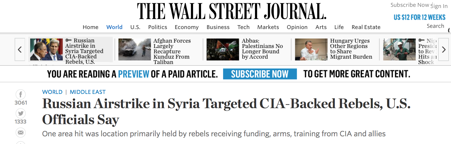 « L'agence d'espionnage étasunienne arme et entraîne des rebelles en Syrie depuis 2013 pour combattre le régime d'Assad. » ( WSJ, le 30 septembre 2015; soulignement ajouté. Note de l'auteur : un soutien tacite est fourni depuis le début de la guerre en mars 2011.)