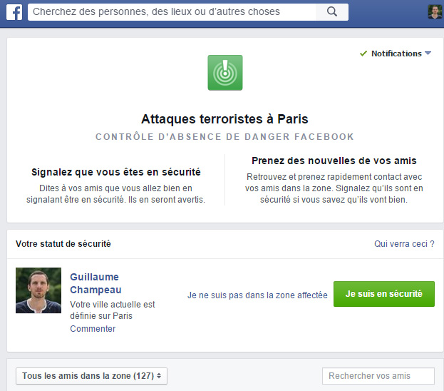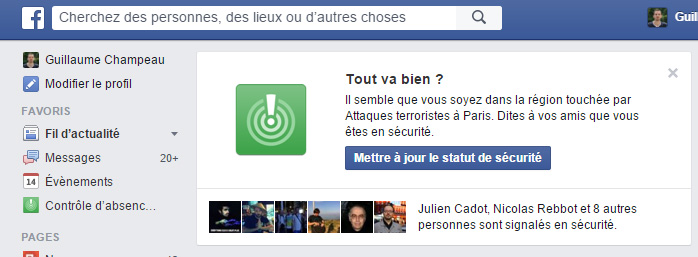 C'est un outil inventé en 2014 que l'on avait vu déployé pour des catastrophes naturelles, notamment lors du séisme au Népal en avril dernier. On imaginait pas qu'il puisse également être déployé en France, pour des attentats terroristes d'une ampleur telle qu'elle glace le sang et incite Facebook à réagir très vide pour aider chacun des internautes parisiens à rassurer leurs proches.