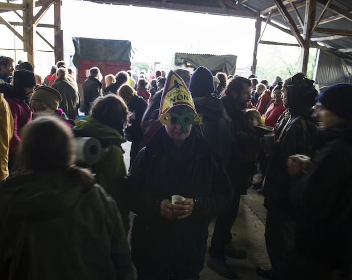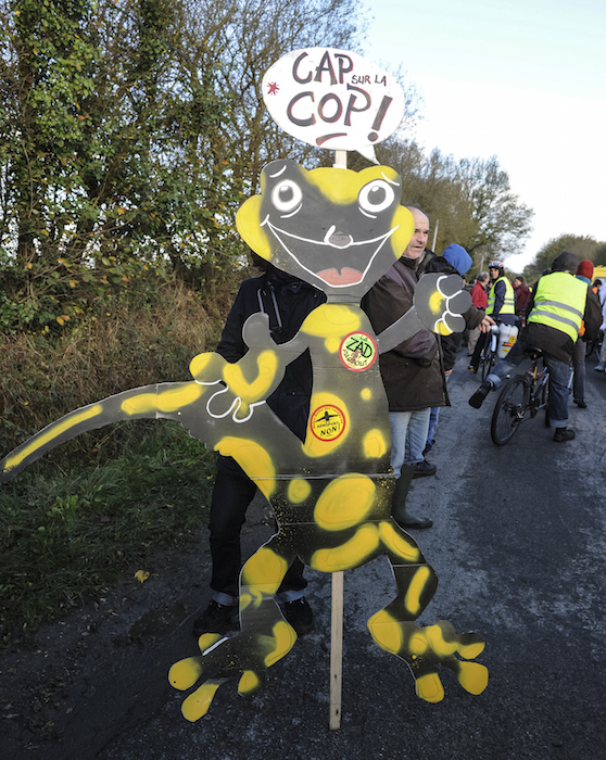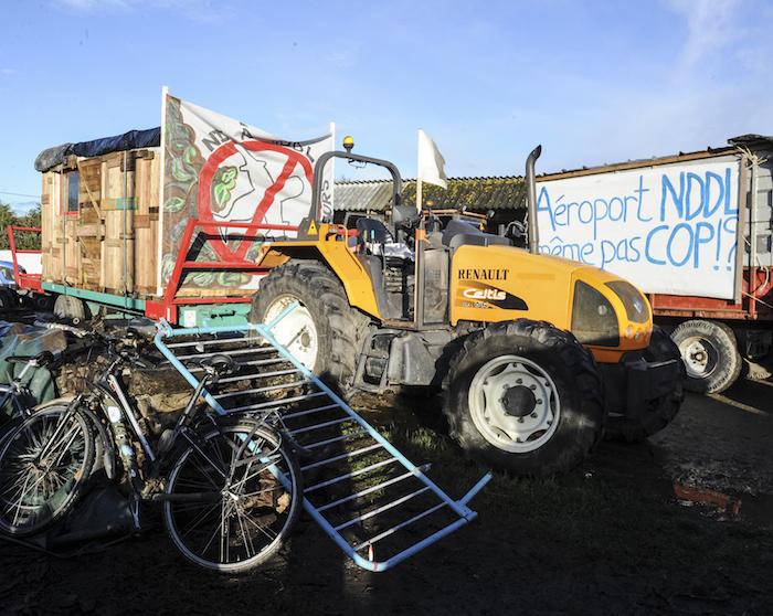 Une dame emmitouflée apparaît derrière un camion orné d'une banderole « Cap sur la COP », et lance dans un sourire : « Vous rejoignez le convoi ? ». Le lieu-dit du Bois-Midi accueille pour un soir la tracto-vélo, une caravane d'un genre nouveau partie de Notre-Dame-des-Landes samedi 21 novembre en direction de Paris.