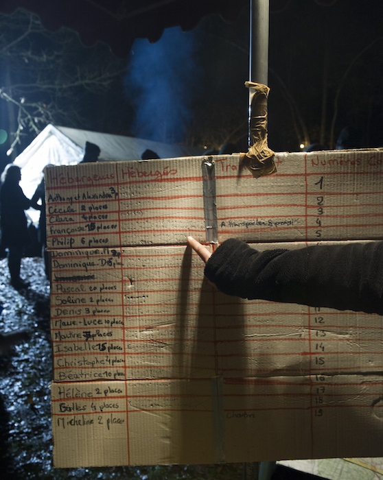 Dehors, deux jeunes hommes grimpent sur une estrade improvisée, mégaphone en main. Ce sont les crieurs du soir, chargés de déclamer les messages reçus toute la journée dans la petite « boîte à mots ». Ils annoncent : « Recherche une écharpe noire », « On est bien tous ensemble ! », « Qui veut apprendre à fabriquer un moteur à électrolyse ? »... et puis un « Bienvenue aux gens du Sud ! ». Car ce soir, une vingtaine de marcheurs partis de la ZAD d'Agen début octobre viennent de rejoindre le convoi. D'autres militants en provenance de Bure (Meuse) sont attendus le lendemain.