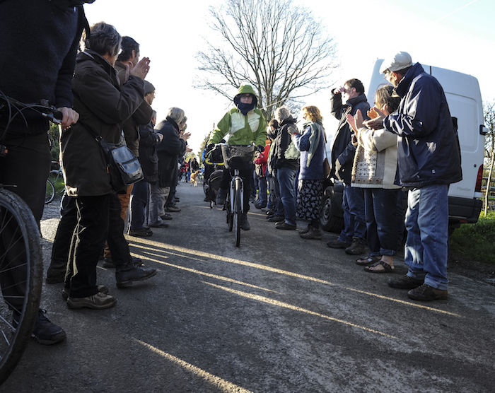 Après une tasse de café, des réunions techniques et un grand rangement, tout le monde se met en branle. Une voiture passe en tête, suivie d'une centaine de cyclistes. Puis viennent les tracteurs et autres véhicules à moteurs, avant un autre peloton cyclopède. Vélos couchés dernier cri ou engins rafistolés, chacun se met en selle. Les sonnettes répondent aux trompettes, des « COP21, mascarade ! » résonnent entre les arbres. Certains arborent des masques colorés, pour éviter d'être identifié par les gendarmes et les RG (renseignements généraux) qui suivent de près la procession.