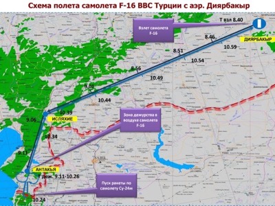 Selon le général Viktor Bondarev, durant tout son vol, le bombardier Su-24 a maintenu une distance de plus de 5 km de la frontière syro-turque, avant d'entrer dans la zone possible de tir du missile air-air guidé par la chaleur par l'un des avions F-16 turc, qui a volé presque perpendiculairement à la direction du vol des bombardiers Su-24. L'avion turc a effectué un virage de 110 degrés, d'une durée de 1 minute et 40 secondes, dans le but d'atteindre le bombardier russe dans sa partie arrière. À cause de ce virage, le F-16 turc est entré de deux kilomètres dans l'espace aérien syrien (dans lequel il est resté pendant environ 40 secondes, alors que le Su-24 n'est entré que 17 secondes dans l'espace aérien turc) suffisamment pour être visible sur les écrans radar de la base aérienne de Hmeymim, pendant le dégagement de l'attaque durant lequel il a plongé en dessous de l'altitude de 2 500 m.