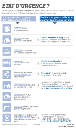 En discussion entre l'Élysée, Matignon, le ministère de l'intérieur et la Chancellerie, le contenu de ces textes est encore susceptible d'évoluer. Le plus abouti est celui de la réforme de la Constitution visant à consolider l'état d'urgence. Si le projet de texte, dont l'Agence France-Presse a eu copie jeudi, ne prévoit pas de durée maximale, celle-ci restant fixée par la loi, il prévoit en revanche que les mesures d'exception, par exemple les assignations à résidence, puissent être prolongées après la fin de l'état d'urgence «pendant une durée maximale de six mois».