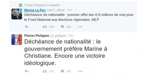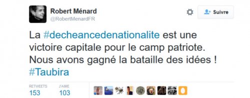 La déchéance de nationalité en France pose un problème de fond capital sur le principe fondamental qu'est le droit du sol. Elle pose également un problème de mémoire. En effet, la seule fois en France où on a dénaturalisé des Français, c'était par loi du 22 juillet 1940. Sous Vichy, juste avant de voter une loi sur le statut des juifs. À l'époque Raphaël Alibert, le ministre de la Justice du maréchal Pétain déclarait au Journal des débats le 24 juillet 1940 : « les étrangers ne doivent pas oublier que la qualité de Français se mérite. » Depuis, les Le Pen, Robert Ménard, Xavier Bertrand lui ont emboité le pas. Aussitôt la nouvelle apprise, Florian Philippot a applaudi sur Twitter : « Déchéance de nationalité : le gouvernement préfère Marine à Christiane (Taubira). Encore une victoire idéologique. »