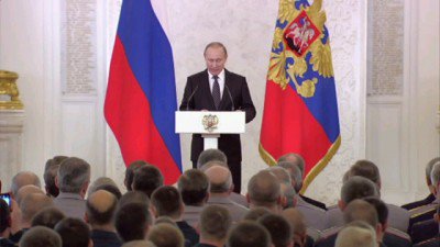 Lors d'une réunion à la salle Saint George, au Kremlin, Vladimir Poutine a décoré des militaires et des spécialistes de l'industrie de la Défense qui se sont distingués dans la réussite des missions sur le territoire de la République arabe syrienne. Plus de 700 officiers et des personnels des Forces aérospatiales, de l'Armée de terre et de la Marine assistaient à la cérémonie, ainsi que des représentants du complexe militaro-industriel.