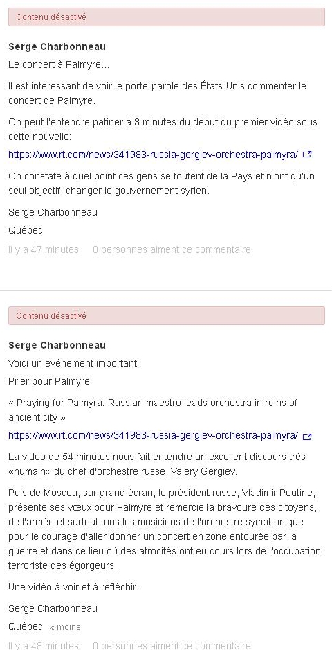 On a beau se donner comme mandat de faire haïr l'armée arabe syrienne ainsi que Poutine et l'armée russe, il est totalement inadmissible que l'on tienne sous silence ce concert servant à redonner de l'« HUMANITÉ ».