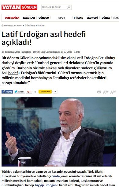 « Quand le coup d'État a échoué, Gülen a déclaré aux médias : "Je m'oppose au coup d'État", mais je sais que chaque étape du plan de coup d'État a été révisée et approuvée par Gülen », a déclaré Latif Erdogan au journal Vatan.