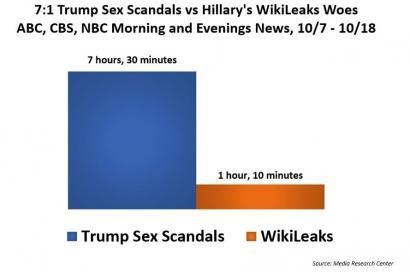 La couverture des élections de la part des médias traditionnels, CNN, CBS, ABC, ou encore le New York Times, a été particulièrement partisane, comme le montre le temps d'antenne consacré à la « Trumptape », comparé aux révélations de Wikileaks sur Hillary Clinton selon le calcul du Media Research Center pour la période du 07 au 18 octobre :