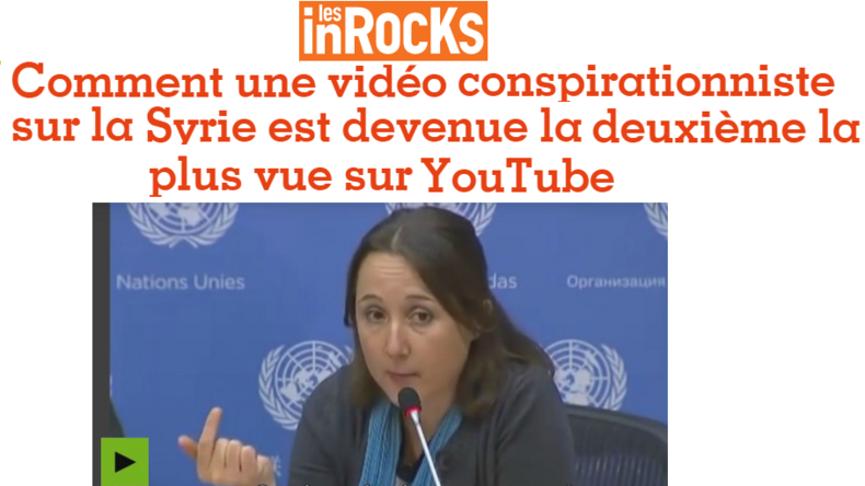 «Comment une vidéo conspirationiste sur la Syrie est devenue la deuxième la plus vue sur Youtube ?» Telle est la question que se posent Les Inrocks après le succès de cette vidéo relayée par RT et intitulée «ONU : une journaliste démonte en deux minutes la rhétorique des médias traditionnels sur la Syrie». Alors qu'elle a été visionnée plus de 400 000 fois en moins de deux jours, le site de l'hebdomadaire a décidé de protéger la version «officielle» de la situation en Syrie et de s'engager contre le «complotisme de la propagande russo-syrienne».