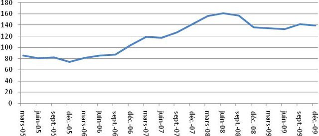 Les banques grecques ont poussé leurs clients à recourir massivement au crédit pour financer leur consommation. Comme le montre le graphique 4 les crédits aux ménages ont été multipliés par 5 entre 2001 et 2008 ; quant aux crédits aux entreprises non financières, ils ont été multipliés par 2,5. Par contre, sur cette même période, les banques grecques ont réduit leurs crédits aux pouvoirs publics.