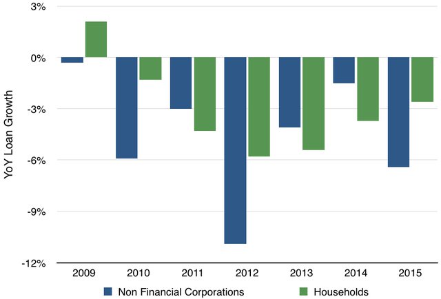 Les banques grecques ont fermé le robinet du crédit aux ménages et aux entreprises non financières, ce qui a aggravé la crise. Les entreprises non financières (l'écrasante majorité des entreprises non financières est constituée de microentreprises avec un personnel inférieur à 10 salariés |26|), en particulier, et les ménages avaient besoin de refinancer leurs dettes afin de pouvoir poursuivre les remboursements. En coupant les crédits, les banques ont renforcé les difficultés des entreprises et des ménages dont un nombre croissant a dû suspendre le paiement de la dette, ce qui a fait augmenter la quantité de NPL's.