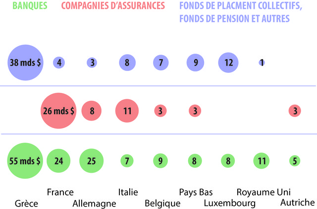 Comme le montre l'infographie ci-dessous, l'écrasante majorité des dettes grecques externes était détenue par des banques européennes, en particulier des banques françaises, allemandes, italiennes, belges, hollandaises, luxembourgeoises et britanniques.