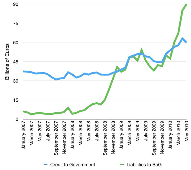 On voit qu'à partir de septembre 2008, les crédits des banques grecques au gouvernement qui oscillaient entre 30 et 40 milliards € augmentent fortement et atteignent plus de 60 milliards € en mars 2010.