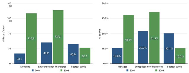 |17| À noter que l'augmentation des dépôts des ménages et des entreprises s'explique pour une bonne part non par une augmentation de l'épargne de ces agents économiques, mais par les dépôts sur leurs comptes provenant des crédits octroyés par les banques, ou dit autrement l'augmentation des dépôts est en grande partie la conséquence de l'endettement de ces acteurs.