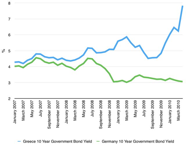 Dans le graphique ci-dessous, on voit que les taux allemand et grec étaient très proches entre 2007 et juillet 2008. Après cette date, on voit également que le taux payé par la Grèce augmente au cours du 4e trimestre 2008, après que le gouvernement a annoncé qu'il mettait en œuvre un premier plan de sauvetage des banques grecques (les marchés ont dès lors considéré que les risques sur la dette publique augmentaient, car les autorités étaient disposées à augmenter la dette publique pour venir en aide aux banques grecques). À partir de ce moment, l'évolution entre les taux allemand et grec varie de manière tout à fait opposée. Il est frappant par ailleurs de constater que le taux payé par la Grèce a baissé entre mars 2009 et novembre 2009, alors que la situation réelle des banques grecques et la crise économique internationale qui a affecté durement la Grèce à partir de 2009 (c'est-à-dire plus tard que pour les pays les plus forts de la zone euro) auraient dû amener les banques internationales et grecques à exiger des primes de risque. Ce n'est qu'à partir de novembre 2009, quand Papandreou décide de dramatiser la situation et de falsifier les statistiques sur la dette publique, que les taux augmentent de manière dramatique.