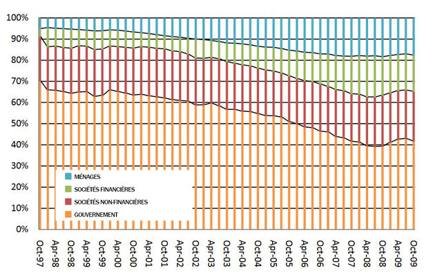 Le graphique 6, qui porte sur l'évolution de la composition de la dette grecque totale pendant la période 1997-2009, permet de visualiser la forte augmentation de la dette des ménages, des sociétés financières (principalement les banques) et des sociétés non financières. Par contre, on constate une diminution de la part correspondant à la dette publique qui passe de 70% à 42% entre 1997 et 2009.