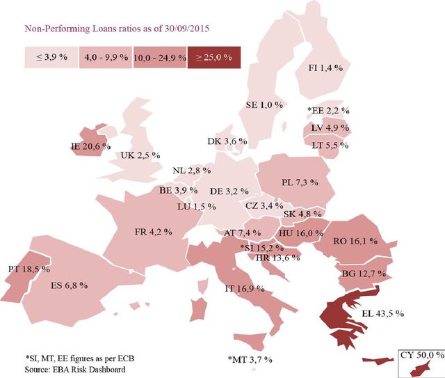 Ce risque s'est significativement accru ces dernières années, puisqu'une note du Parlement européen a estimé les prêts à risque de la Grèce à 43,5 % en septembre 2015, et ceux de Chypre à 50 %.
