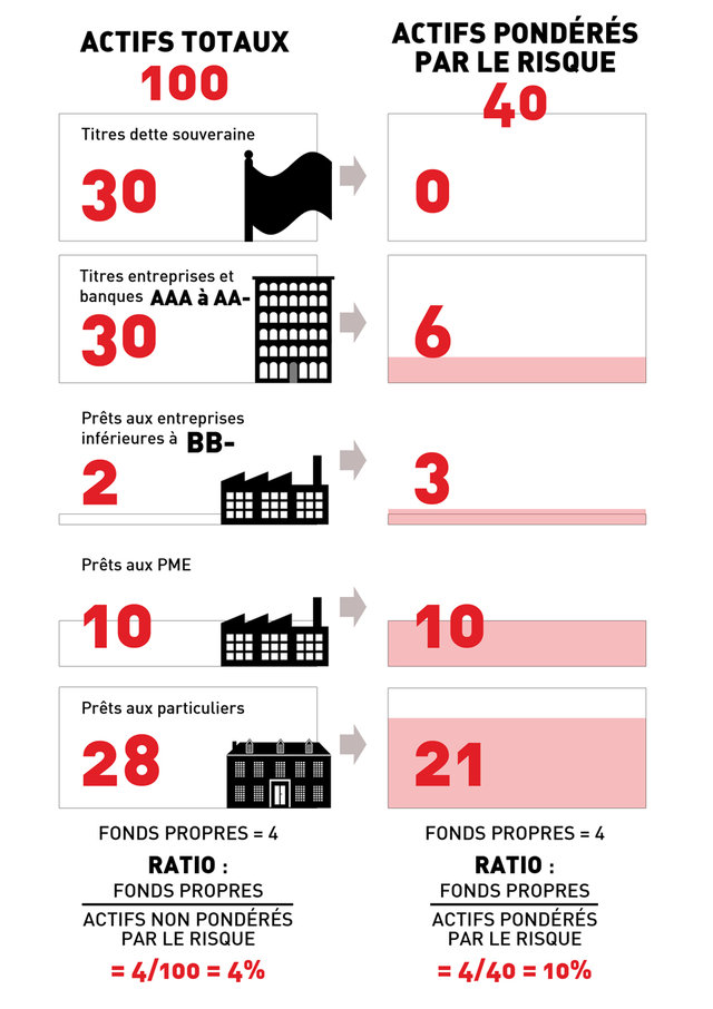 Pour chacune de ces catégories d'actifs, la banque va appliquer une pondération par le risque sur laquelle elle va s'appuyer pour déterminer son ratio de fonds propres par rapport aux actifs qu'elle détient. Par exemple, les prêts aux particuliers sont pondérés à 75 %, ce qui signifie que sur 28 unités prêtées, on ne va en compter que 21 dans le bilan pondéré. En règle générale, les prêts aux États (titres de la dette souveraine) sont eux pondérés à 0 % : ils comptent pour 0 dans le bilan pondéré ! En fait, seuls les prêts aux PME et aux entreprises « mal notées » par les agences de notation sont comptabilisés entièrement, voire pour plus que ce qu'ils représentent réellement (pondération de 150 % pour les entreprises dont la note est inférieure à BB-).