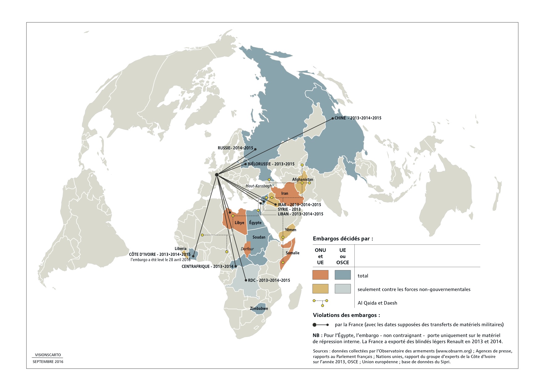 Des dizaines de pays sont ainsi interdits de livraisons d'armement. La Libye, la Côte d'Ivoire, l'Iran, ou encore la République centrafricaine sont sous embargo, suite à des décisions du Conseil de sécurité des Nations-Unies. Le Soudan, le Soudan du Sud, la Syrie et la Chine sont sous embargo de l'Union européenne. Mais l'embargo européen sur les ventes d'armes à la Chine n'a pas empêché la France de fournir pour plus de 500 millions d'euros d'armements à Pékin entre 2010 et 2014.