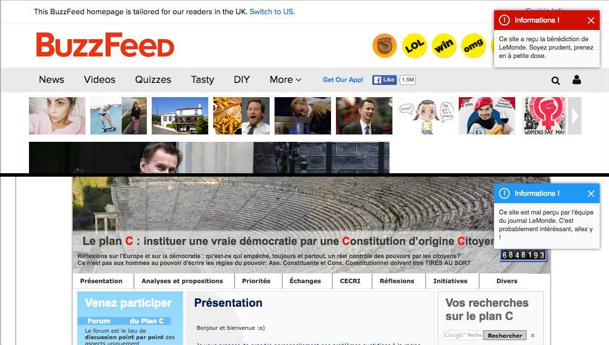 Pour celles et ceux qui se diraient que ça n'affectera que les réseaux sociaux, sachez qu'ils ont aussi créé des modules pour Chrome et Firefox. Ainsi quelqu'un qui a installé le module aura les consignes du Décodex partout sur le web... Les Antifas en rêvaient, Le Monde l'a fait.