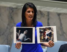 Rappelons qu'à ce jour, aucune donnée objective n'existe, puisqu'aucune enquête sérieuse n'a été encore faite, les photos des Casques blancs, habitués par ailleurs à la mise en scène, sont toutefois suffisantes pour les membres du Conseil de sécurité de l'ONU. Notamment la France, la Grande Bretagne et les Etats Unis qui accusent Assad et la Russie en brandissant des photos. Il est vrai que le Conseil de sécurité de l'ONU a de fortes traditions en la matière. Ici, Nikki Haley remplace avantageusement Colin Powell.