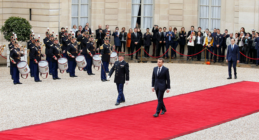Le plus jeune président français jamais élu, âgé de 39 ans, a remonté d'un pas lent le tapis rouge devant un détachement de la Garde républicaine, avant d'être accueilli par son prédécesseur sur le perron du palais présidentiel.