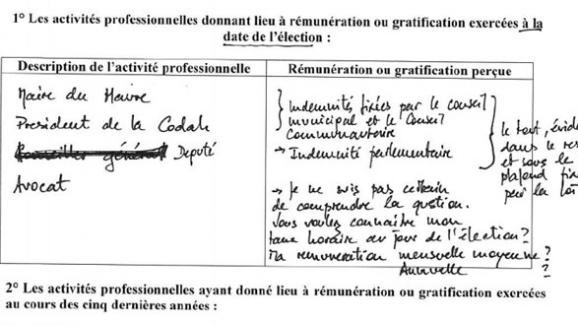 «Comme beaucoup de parlementaires sans doute, j'ai essayé de concilier le respect de la loi et une forme de mauvaise humeur», se justifie-t-il devant les journalistes de Mediapart. Comme le note le journal en ligne, «sa mauvaise humeur en la matière a l'air de remonter loin en arrière, car sur de précédentes déclarations fournies en tant qu'élu local, le juppéiste raconte avoir déjà rempli les mêmes cases avec des points d'interrogations». Petit détail cocasse : Edouard Philippe semble ne pas bien connaître l'ensemble des mandats qui sont les siens. Sur sa déclaration de patrimoine de 2014 figure en effet la mention, apparemment rectifiée par la suite, d'un mandat de «conseiller général»... qu'il n'occupait déjà plus depuis deux ans.