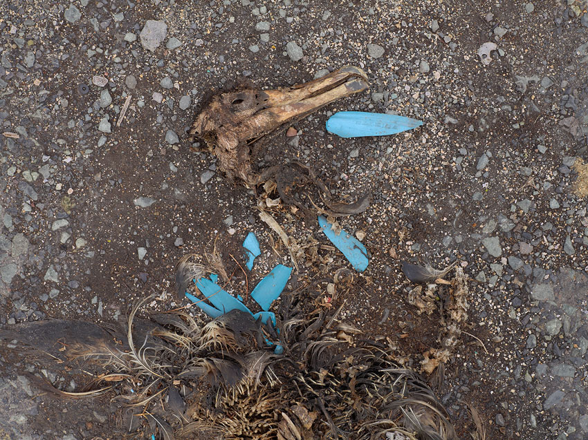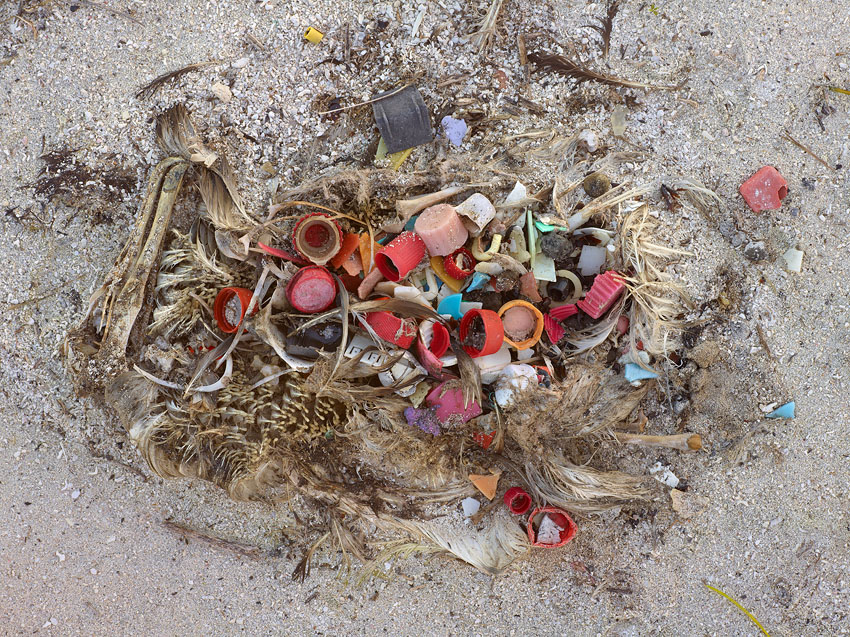 C'est ici, au pays des géants des mers, qu'il faut venir, pour trouver le tableau complet de notre siècle. Au bord de ce grand bleu menteur qui fait croire à une nature vierge, il y a ma brosse à dents, mon briquet, mon playmobil, dans un cercle d'os bordé de plumes, à des centaines de milliers de kilomètres de chez moi.