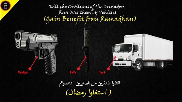 Traduction : « Tuez les civils parmi les croisés, roulez-leur dessus avec des véhicules (tirez profit du Ramadan) »
