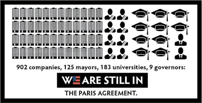 Mardi 6 juin, 143 villes, dont Los Angeles et New York, 9 Etats (sur 51), plus de 1.000 entreprises parmi lesquelles Apple, Amazon, Facebook ou Microsoft, ont lancé l'initiative We are still in. Comprendre : « Nous sommes toujours dans l'accord de Paris ». « Nous représentons 120 millions d'étasuniens et contribuons à hauteur de 6.200 milliards de dollars à l'économie américaine », précisent les signataires dans un communiqué, soit 40% de la population du pays. Sous la houlette du milliardaire et ancien maire de New York Michael Bloomberg, ils ont publié « une lettre ouverte à la communauté internationale », réaffirmant leur volonté d'atteindre, voire de dépasser les engagements pris par les Etats-Unis lors de la signature de l'accord de Paris. Pour rappel, le second plus gros pollueur de la planète avait alors promis de réduire ses émissions de CO2 de 26 à 28 % en 2025 par rapport à 2005.
