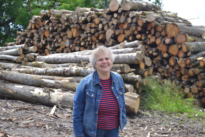 Lucienne Haese devant les troncs de feuillus fraîchement coupés, merisier, chêne, hêtre et châtaignier.