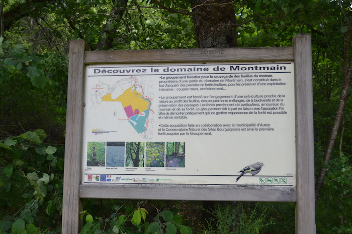 Un panneau indique la parcelle de forêt du massif de Montmain, la première acquise par le groupement, en 2003.