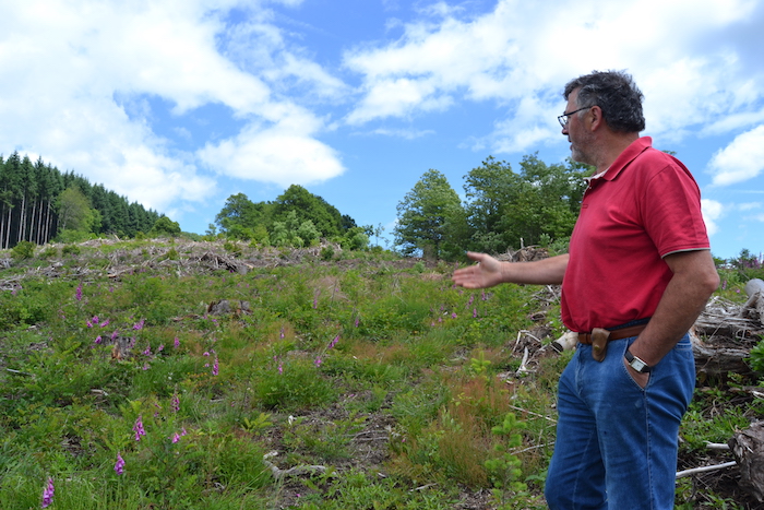 Plus loin, la forêt est plus mature. Hêtres, châtaigniers, chênes et sorbiers cohabitent sur un sol couvert de feuilles, de bois mort véritables hôtels à insectes et de jeunes plants vert tendre. Jacques Gorlier en profite pour offrir une petite leçon de futaie irrégulière : « Plutôt que raisonner à la parcelle, on sélectionne pied par pied les arbres à couper, pour les vendre, mais aussi pour améliorer le peuplement. L'objectif est d'apporter de la lumière pour favoriser la régénération naturelle », explique-t-il en désignant un petit espace ensoleillé, sans vieux arbres. Parmi les jeunes pousses qui s'y enchevêtrent se glissent quelques douglas. Pas question pour autant de les arracher au nom d'une croisade anti-résineux. « Ce ne sont pas les douglas le problème, ce sont la monoculture et les coupes rases », glisse Lucienne Haese.