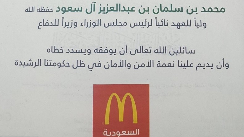 La filiale saoudienne de McDonald's, détenue par un membre de la famille royale, a fait allégeance au prince héritier nouvellement nommé avec une pleine page de publicité dans la presse. Le serment a aussi été publié sur le réseau social Twitter.