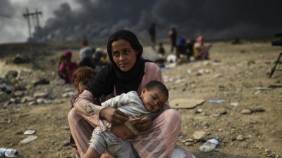 Les hommes, les femmes et les enfants qui ont échappé à la destruction de Mossoul ont été logés dans des camps de tentes, souvent sous la forme de quasi-prisonniers. Les femmes et les enfants soupçonnés d'être membres de la famille des combattants de l'État islamique tués dans le siège sont envoyés dans des « camps de réhabilitation » désolés.