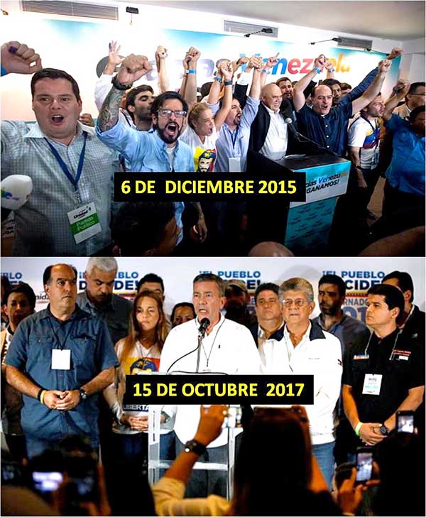 Après l'inattendue victoire chaviste, les camps en présence ne jouent plus le même jeu. La furibonde María Corina Machado accuse les « cogollos » [15] d'être complices de la fraude pour avoir accepté les conditions, imposées par le pouvoir, dans lesquelles se dérouleraient ces élections. Plus ou moins trotskiste, censé représenter la gauche politique, le politologue Nícmer Evans reproche à la MUD (la droite et l'extrême droite) de « ne pas avoir inclus le chavisme critique dans sa stratégie [16] ».Les candidats d'opposition vaincus hurlent au scandale, avec plus ou moins de conviction. Mais pas tous. Gouverneur sortant de l'Etat de Lara et candidat de la MUD Henri Falcón déclare :