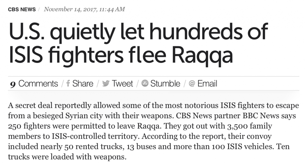 Comme le confirme un article de la BBC intitulé « Raqqa's Dirty Secret », la coalition dirigée par les USA a facilité l'exode de terroristes de Daech et les membres de leurs familles à l'extérieur de leur château fort de Raqqa, au nord de la Syrie.