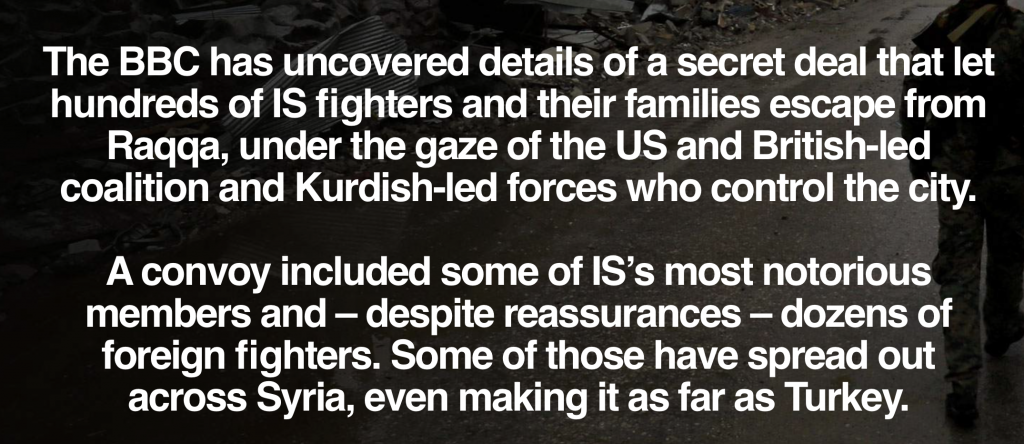 L'article de la BBC laisse entendre l'existence d'un plan méticuleusement préparé pour assurer l'évacuation en toute sécurité des terroristes. L'explication officielle était que l'accord a été conclu par les Forces démocratiques syriennes (FDS). La coalition dirigée par les USA a « laissé faire », sans intervenir militairement pour empêcher l'exode et le passage clandestin de combattants étrangers hors de Raqqa.