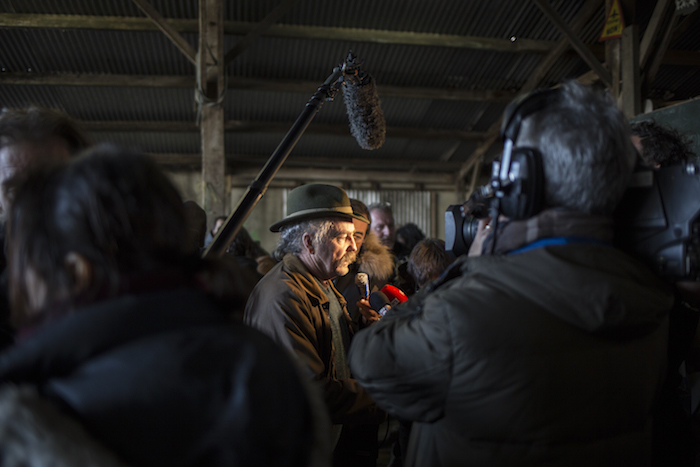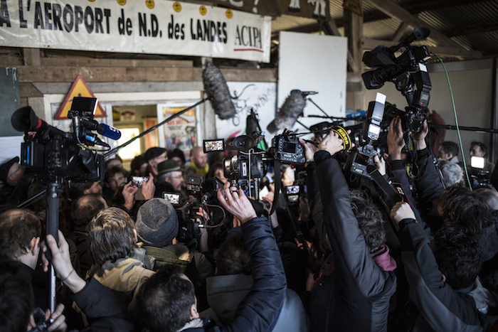 Même ruée au début de la prise de parole des composantes du mouvement, à la Vacherit à 500 mètres de là. La grappe serrée de journalistes pousse vers le mur les porte-parole du mouvement contre l'aéroport. « Libérez nos camarades ! » beuglent des zadistes, hilares. « La Zad, c'est une zone de respect des autres. On peut être pro et respectueux », reprend une photographe indépendante. Les porteurs de caméras jouent des coudes, s'engueulent, on n'entend rien. Cette pathétique mêlée ouverte de médias en meute individualiste aurait bien besoin d'un stage d'autogestion, au moins autant que d'espace de prise de vue.