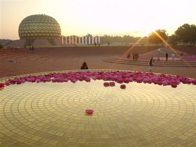 À l'instar des grands monastères qui s'organisaient autour de l'église conventuelle, Auroville se développe, de manière organique autour du Matrimandir. Ce temple, qui constitue un pôle d'attraction magnétique, n'a pas été consacré à l'honneur d'une divinité en particulier, mais représente un hommage gracieux rendu à la paix universelle et symbolise l'aspiration ardente des habitants d'Auroville vers le divin. Sorte de biodôme, rappelant les constructions de l'Américain Buckminster Fuller, les facettes de son enveloppe extérieure ont été recouvertes de feuilles d'or et cette structure prend des allures d'astre flamboyant au coucher du soleil.
