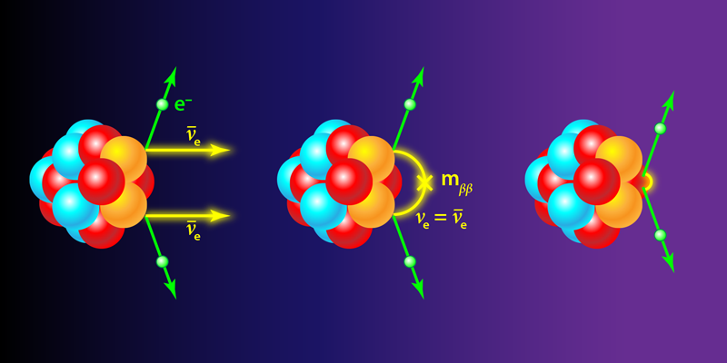 Various mechanisms for this neutrinoless process are possible. They involve the creation and destruction of either a virtual Majorana neutrino (Fig. 1, center) or of some new heavy particle (Fig. 1, right). If nature chooses the first scenario (virtual Majorana neutrinos), the decay rate is proportional to the square of a mass called m𝛽𝛽, which is a weighted average of the masses of the three neutrino mass states. If nature prefers the second option (heavy particles), the relation between the decay rate and neutrino masses is more complicated. But detecting the decay, no matter which mechanism causes it, would tell us that neutrinos are Majorana particles and that there are new particles allowing the nonconservation of lepton number. The discovery that lepton number isn't conserved might also point physicists toward an explanation for the observed asymmetry between matter and antimatter.