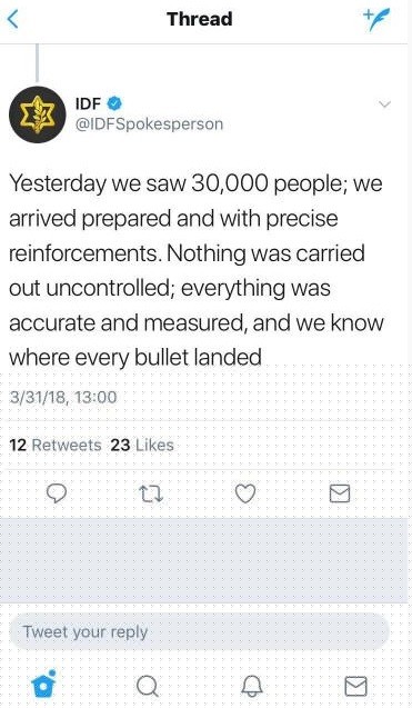 Se défendant d'avoir commis un crime, l'armée israélienne a publié une série de publications sur sa page Twitter afin de légitimer son opération ce jour-là. Quelques heures après la marche, elle a en effet affirmé avoir déjoué une tentative d'attaque de la part du Hamas, considéré comme une organisation terroriste par Israël.