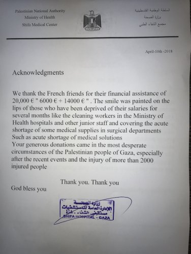 Après l'envoi de 10.000 € fin 2017 et celui de 6.000 € le mois dernier, ce sont 14.000 € qui ont pu être remis ces derniers jours aux responsables hospitaliers, dont nous reproduisons ci-dessous l'accusé de réception et les remerciements.