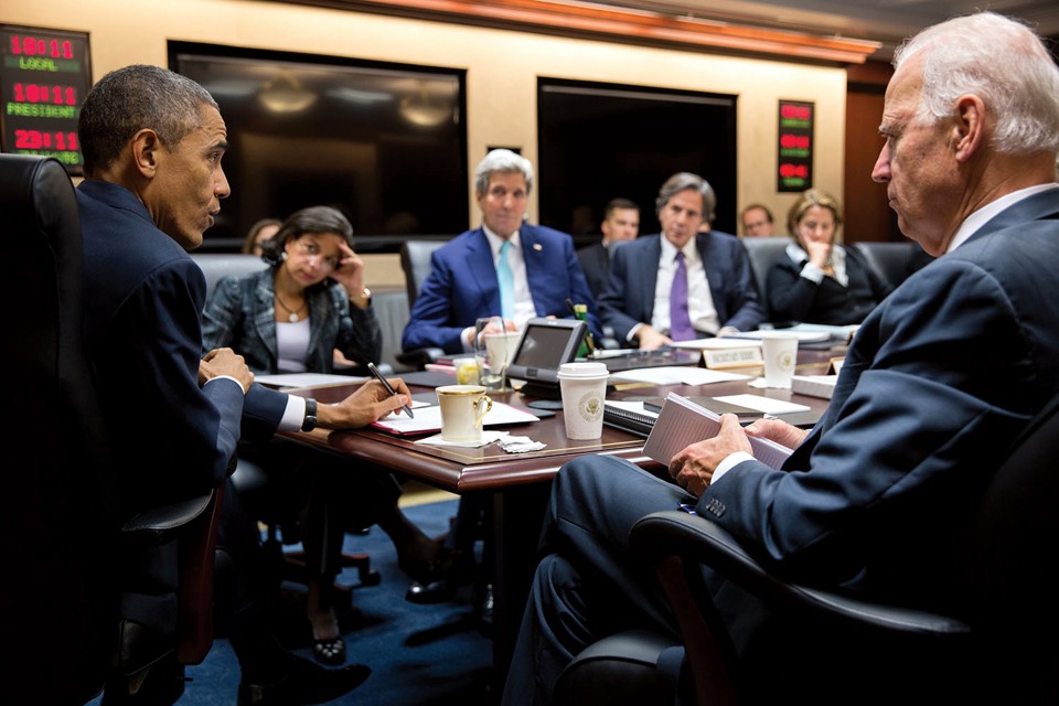 Obama et le vice-président Joe Biden en réunion avec les membres du Conseil pour la sécurité nationale, incluant Susan Rice et John Kerry (deuxième et troisième en partant de la gauche) en décembre 2014.