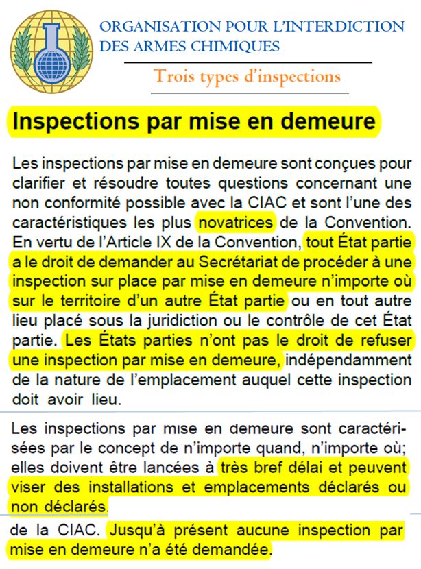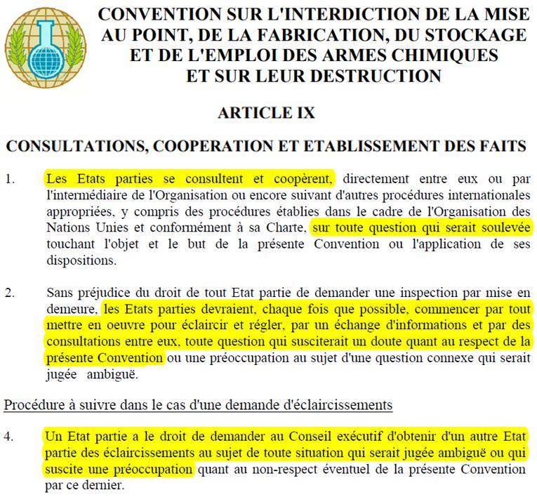 Mais, si les pays occidentaux ont des informations, ce processus d'intervention n'est alors absolument pas conforme à la Convention sur l'interdiction des armes chimiques (signée à Paris en 1993).
