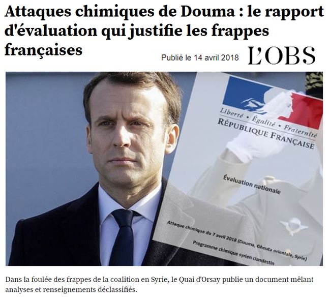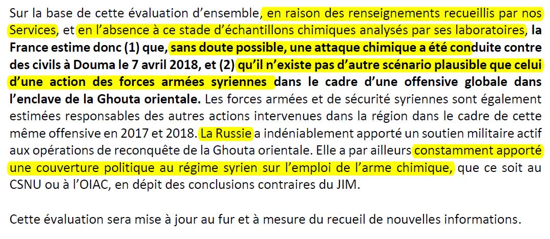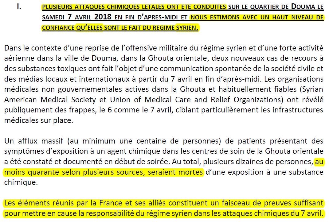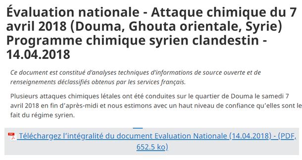 Pour justifier cette action illégale, le ministère des Affaires étrangères a publié un document d'une dizaine de pages mêlant "analyses techniques d'informations de sources ouvertes" et "renseignements déclassifiés obtenus par les services français" :