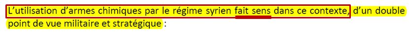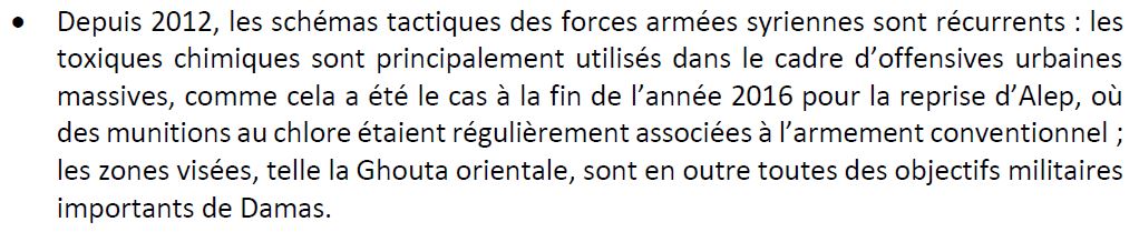 On note tout d'abord ceci. On ne peut évidemment exclure une manipulation du camp islamiste. Mais quand le rapport évoque ceci en quelques mots, il laisse penser que l'hypothèse serait qu'il y aurait alors une manipulation sous la forme d'une "manœuvre de communication" de grande ampleur ; donc, que les rebelles auraient pu monter une "fausse attaque". Mais en réalité, l'hypothèse plus probable serait qu'ils aient monté avec peu de moyens une vraie attaque, qu'ils attribueraient alors à l'armée. C'est peu probable si le gaz utilisé est complexe, mais cela serait plausible si c'était du simple chlore. Or cette hypothèse, plus dure à réfuter, n'est même pas mentionnée...