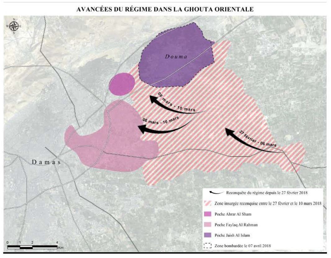 Le rapport se termine par deux annexes. L'une comprend 3 photos insoutenables de cadavres ("Images récupérées localement le 7 avril 2018 par une source également publiées sur Internet", mais non localisables ni datables telles quelles), et une carte :