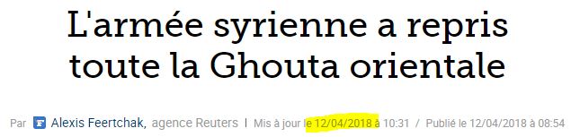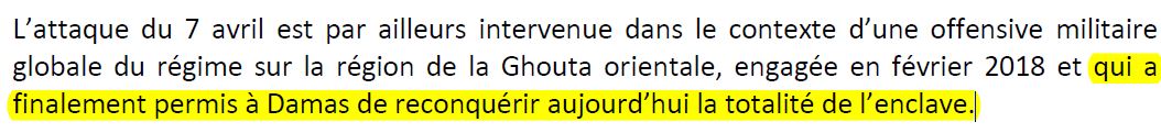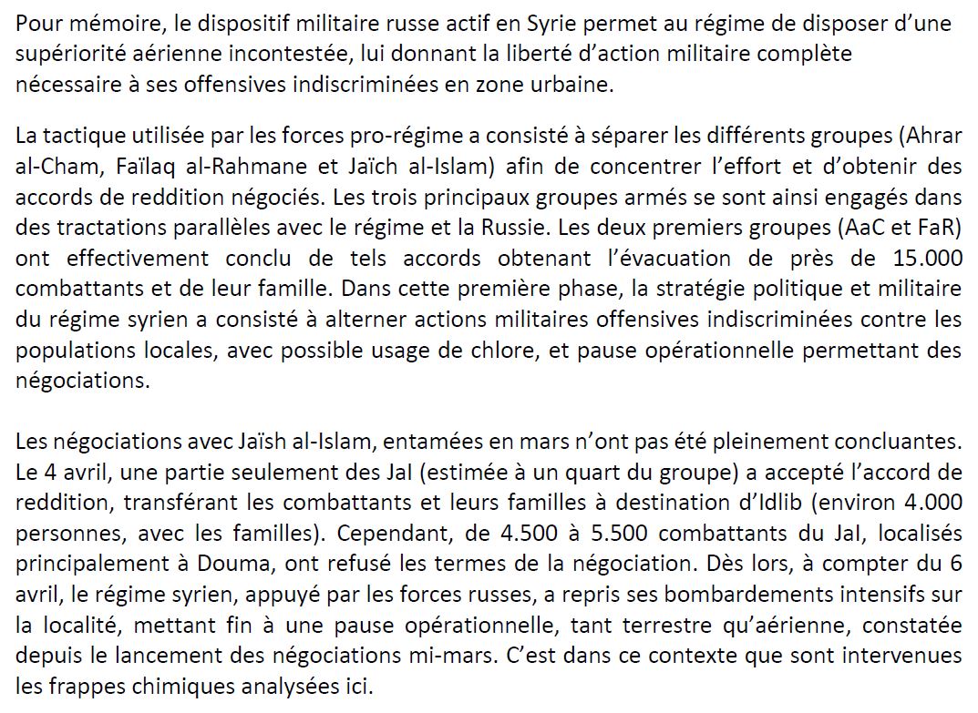 Donc, dans ce contexte, à en croire les propos de notre gouvernement, l'armée syrienne aurait alors attaqué à l'arme chimique le 7 avril. Le moins que l'on puisse dire, c'est que le cas échéant, ce serait un choix stratégique assez stupéfiant.